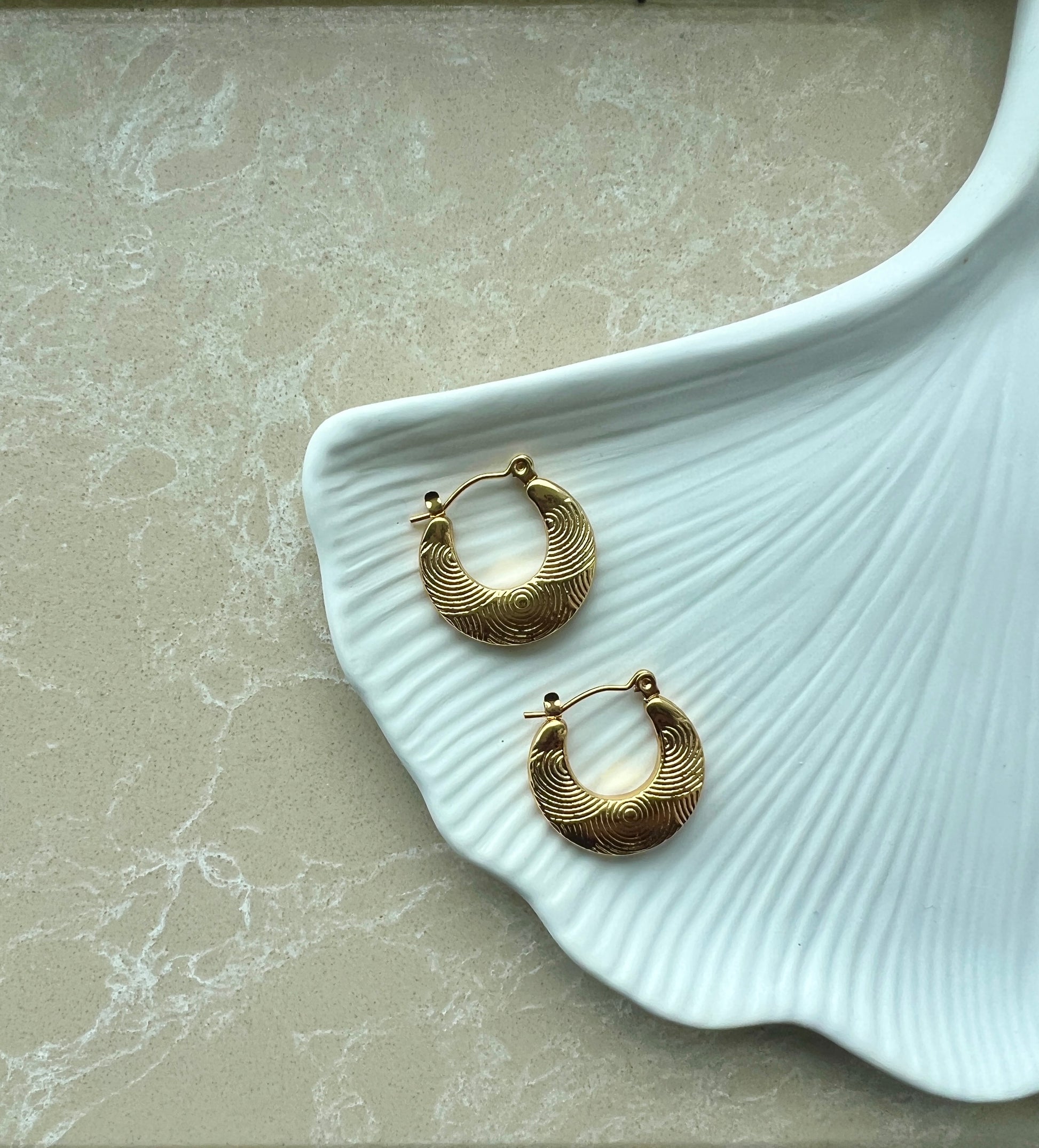 Crafted from durable stainless steel with a refined gold imprint, these small hoops offer lasting elegance and resistance to tarnish. Their subtle size makes them perfect for everyday wear, combining expert craftsmanship with timeless style. Ideal for those seeking a sophisticated yet understated accessory.
